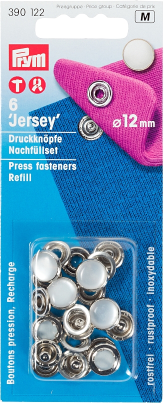 12 mm, Karte 6 Stk.Die Prym Druckknöpfe „Jersey“ sind gekennzeichnet durch ihre leichte bis mittlere Schlusskraft und speziell für dünnere und auch dehnbare Stoffe – wie z. B. oft bei Baby- und Kinderbekleidung verwendet – gemacht. Der Vorteil dieses Druckknopfes ist, dass zur Anbringung kein Loch gestanzt werden muss – vielmehr verdrängt der integrierte Zackenring lediglich den Stoff, so dass dieser geschont wird. Waschen, Schleudern, Reinigen, Bügeln, Mangeln: für die rostfreien Druckknöpfe „Jersey“ aus dem Hause Prym kein Problem. Die Drücker sind in verschiedenen Farben und Dessins erhältlich. Die Druckknöpfe mit 18 mm Größe können nur mit dem beigefügten Werkzeug verarbeitet werden, die Drücker mit 10 bzw. 12 mm Größe auch mit der VARIO-Zange bzw. dem Prym Dreifuß.